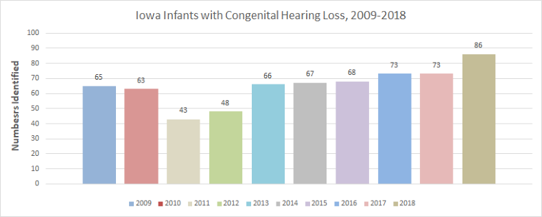We are identifying more and more infants with hearing loss as noted in the graph below. In 2018, we identified 86 children with congenital hearing loss or 2.3/1000. Another 2-3% will be identified with late onset or progressive hearing loss. This magnifies the importance of moving children along from screening to re-screening, and ultimately to a timely diagnostic assessment.