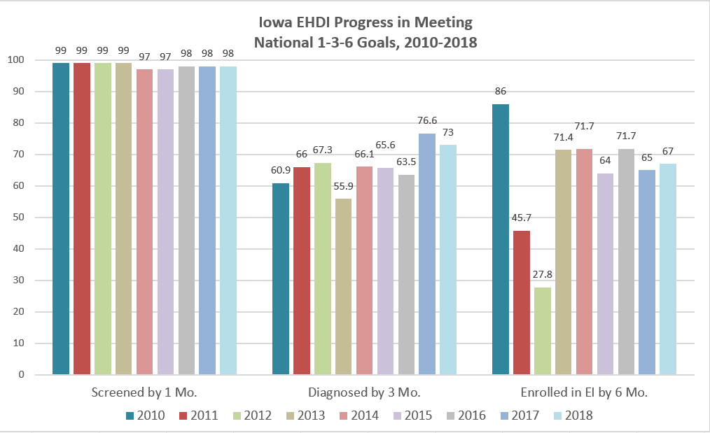 Iowa EHDI ‘s last set (2018) of 1-3-6 outcomes data shows nearly complete success with screening newborns by one month, but only about 3/4 of those newborns with a failed screen are diagnosed by 3 months, and only about 2/3 of those diagnosed with hearing impairment are enrolled in early intervention by 6 months.(See Figure 1)