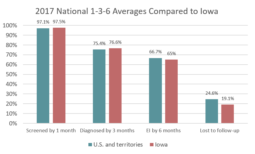 The 2017 Iowa data shows similar outcomes for the 1-3-6-month goals compared with the National averages. However, Iowa is doing even better than the nation in “lost to follow up” with fewer infants being lost to follow up after birth or after failed screens. (See Figure 2)