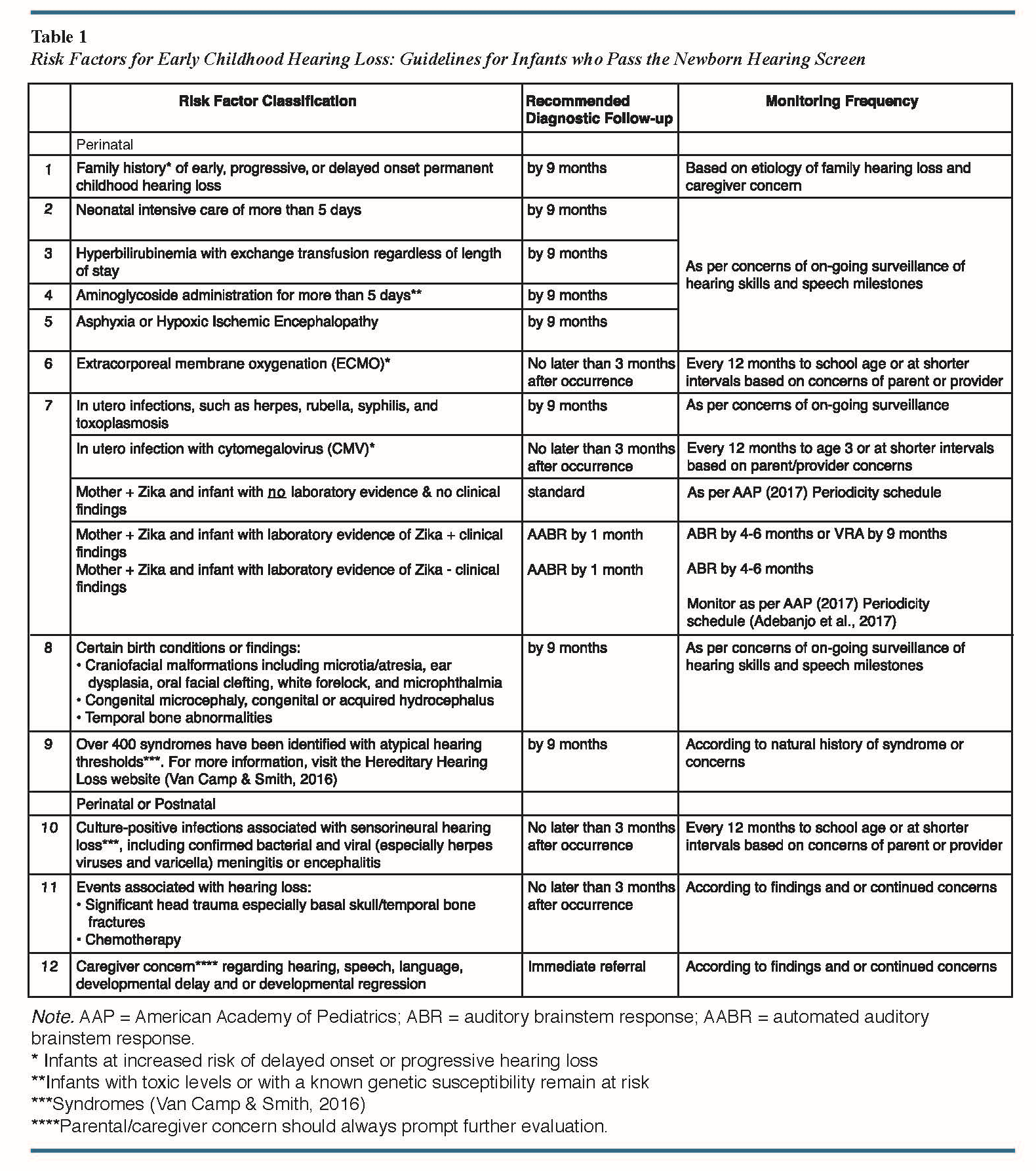 The risk factors for delayed onset hearing loss are now organized differently. Previously there were several factors that required follow up evaluation of hearing by 6 months, and another several that required follow up by 24-30 months. Now, there are 12 risk factors, separated into 2 groups: predominantly perinatal factors, and factors that could be perinatal or postnatal. Also, the follow up period is now by 9 months of age; this represents a closer follow-up for most cases. Other situations should have follow-up no later than 3 months after occurrence; this includes ECMO, congenital CMV, culture-positive infections associated with SNHL, and events (head trauma/skull fracture, chemotherapy) associated with hearing loss. Infants with possible prenatal Zika exposure, suspected or confirmed Zika syndrome, should have a standard screening at birth, and an AABR by age 1 month if the newborn screen was passed using OAE.